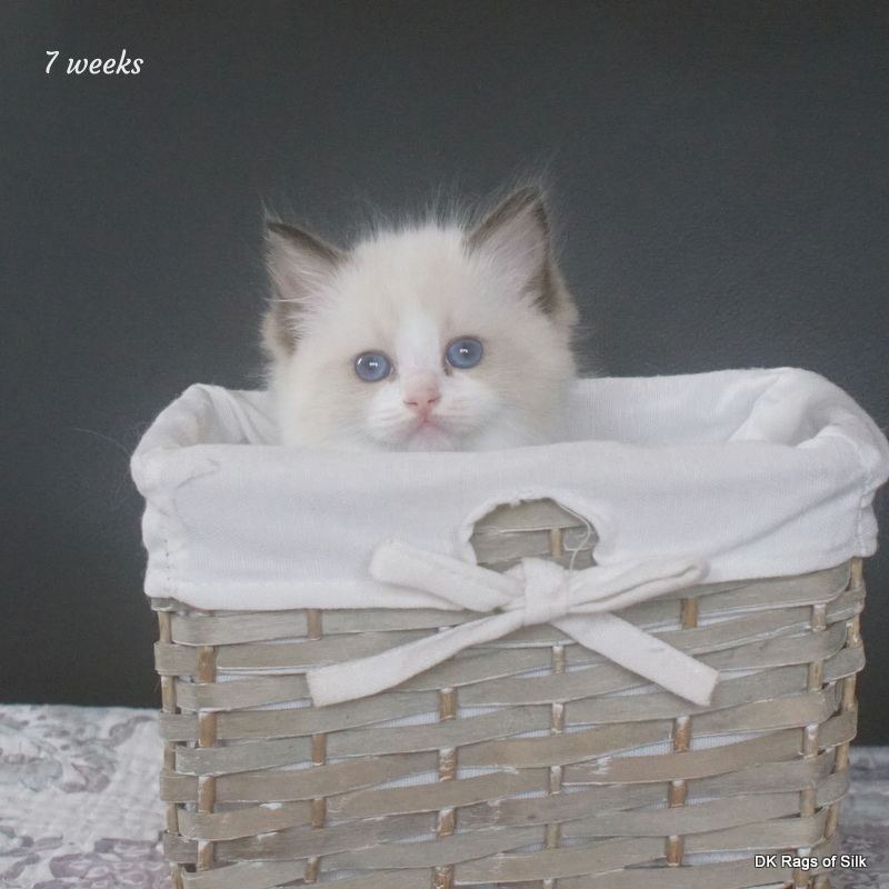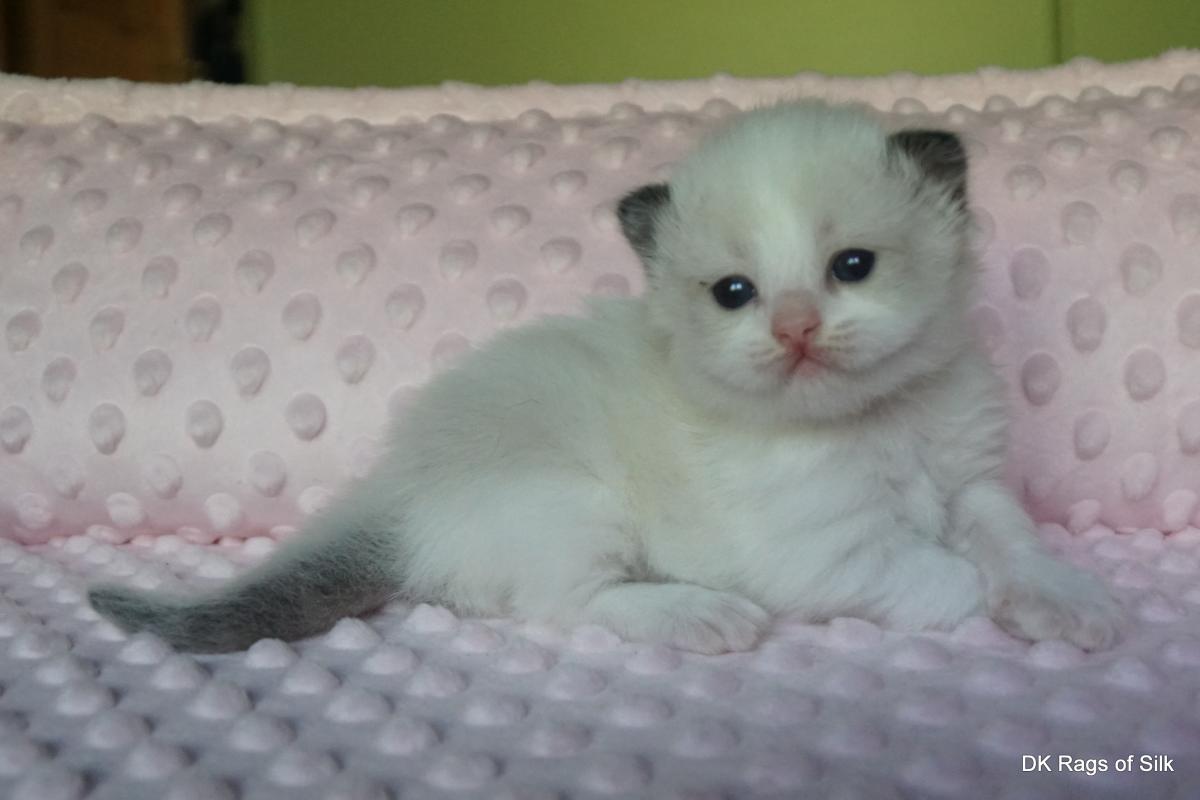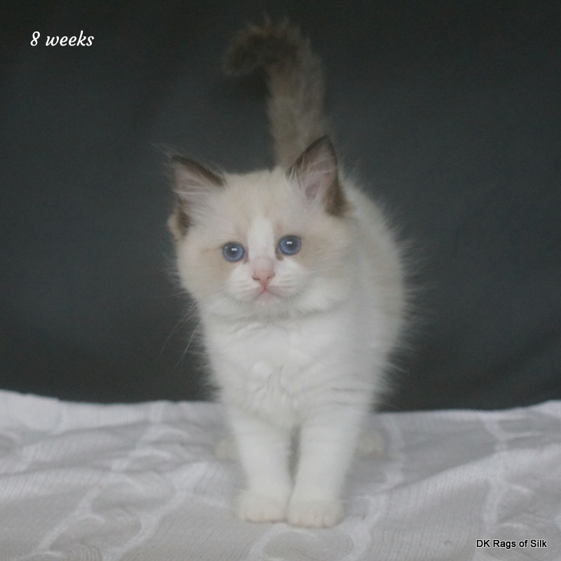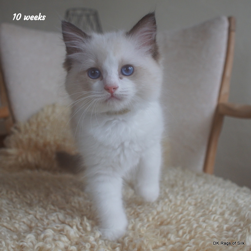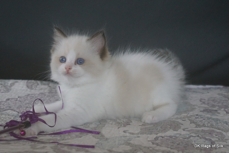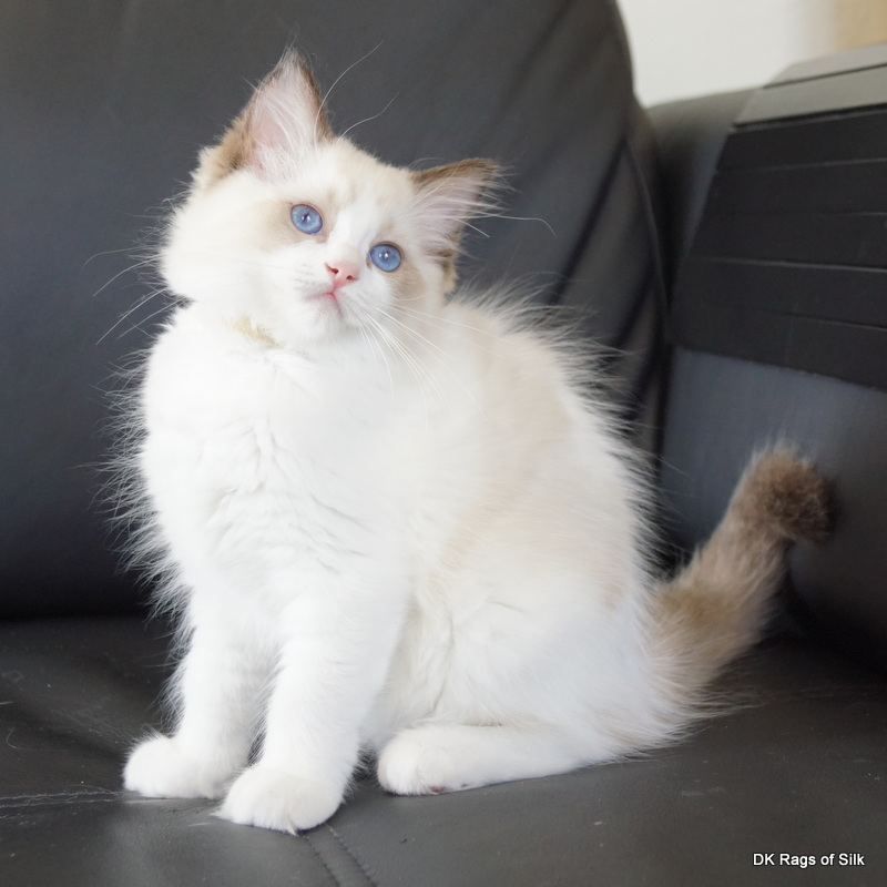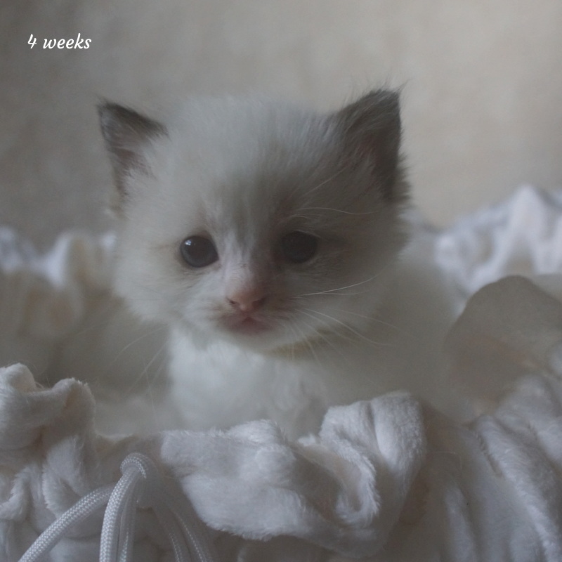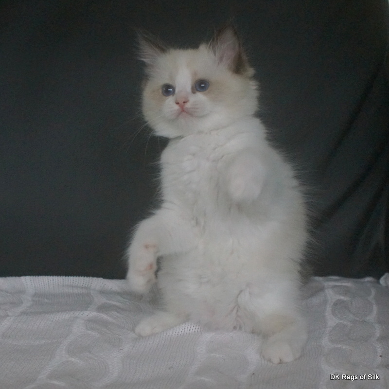 Pumpkin er en skøn lille ragdoll pige. Allerede få uger gammel har hun en dejligt udtryk, god bredde og profil. Hun har et meget roligt og afslappet gemyt. Når vi løfter hende op, slapper hun fuldstændigt af, så hun er en rigtig ragdoll.
