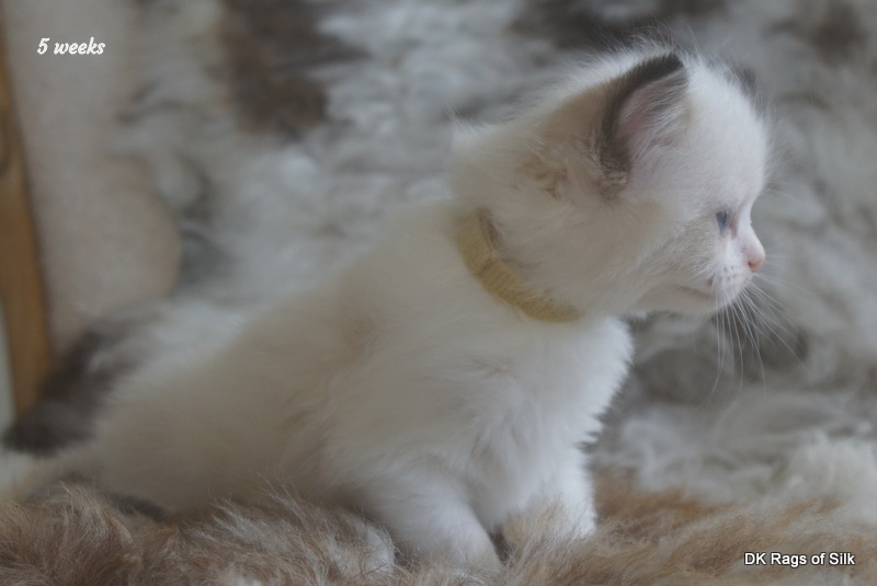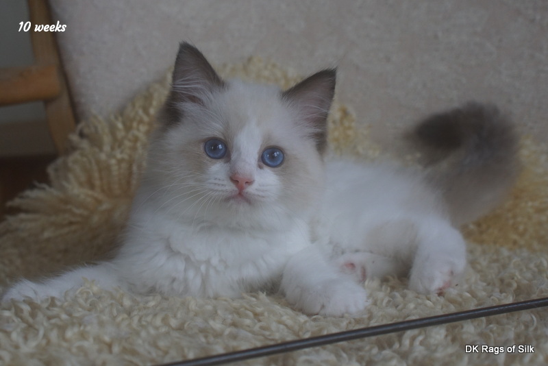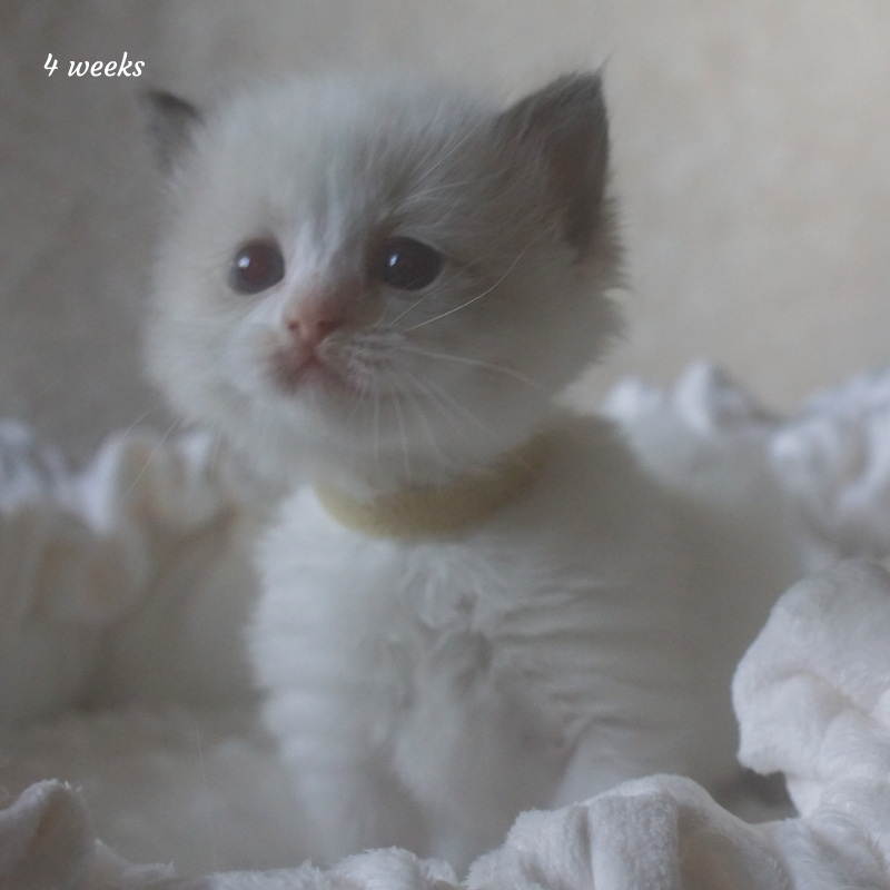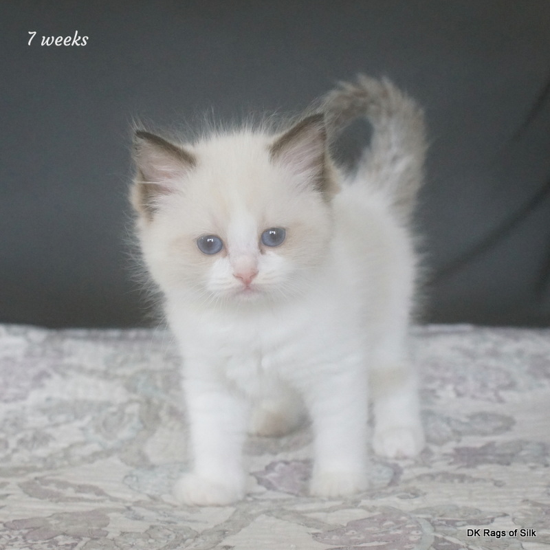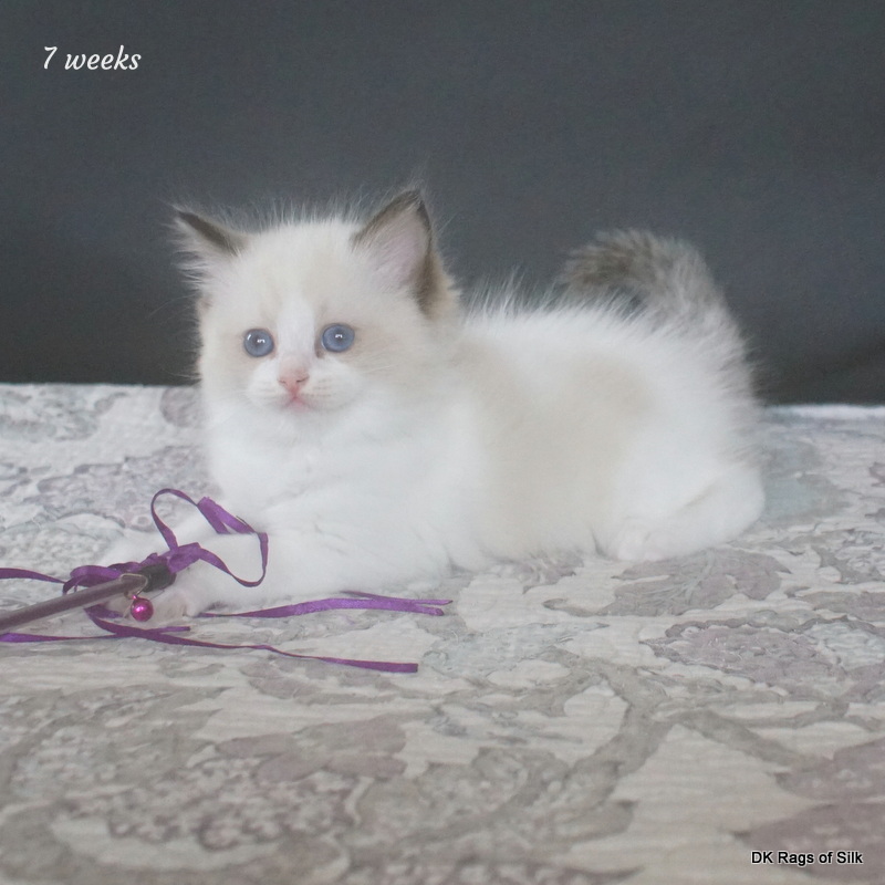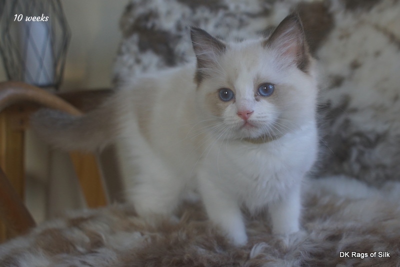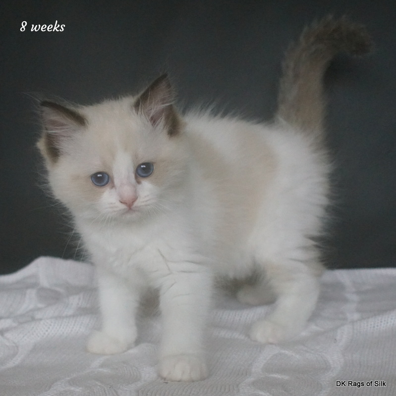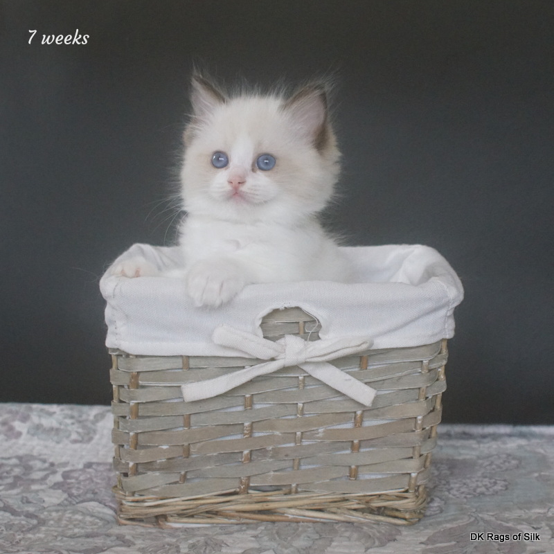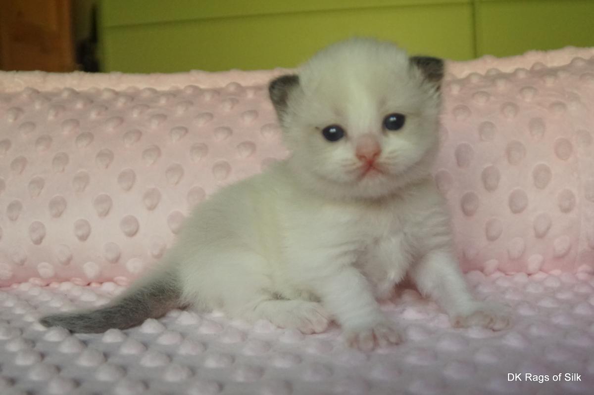 Pumpkin er en skøn lille ragdoll pige. Allerede få uger gammel har hun en dejligt udtryk, god bredde og profil. Hun har et meget roligt og afslappet gemyt. Når vi løfter hende op, slapper hun fuldstændigt af, så hun er en rigtig ragdoll.