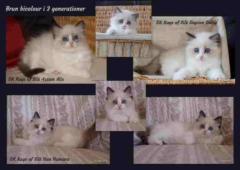 Så er det besluttet! Daisy og Bonifacys lille brune bicolour pige Hamara bliver hos os, nå r de øvrige killinger flytter hjemmefra. Hun bliver 4. generation i vores katteri, da hendes oldemor Ippa var vores første avlkat, som i sit første kuld fik DK Rags of Silk Assam Alix en seal true bicolour pige og Hamaras mormor. Fra Alix' første kuld beholdt vi DK Rags of Silk Dupion Daisy også en seal true bicolour pige - Hamaras mor. Hamara bliver altså 3. generation seal bicolour hos DK Rags of Silk. På collagen herunder kan du se, at hun slægter sin mormor og mor meget på i udseende. Billederne er alle taget i 7-8 ugers alderen. Hamara er en skøn lille pige med et vidunderligt temperament og vores datter Matildas absolutte yndling. Hun har døbt hende Honey Boo Boo, så må ske må vi opgive det fine stamnavn til fordel for reality TV :-) Vi glæder os til at følge hendes udvikling.