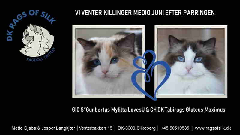Vi er glade for at kunne annoncere, at vi venter killinger mellem vores hunkat Mylitta og DK Tabirags smukke seal bicolour dreng Max. Killingerne forventes at komme til verden medio juni. Tak til Tabita Kehlet for lån af skønne Max.