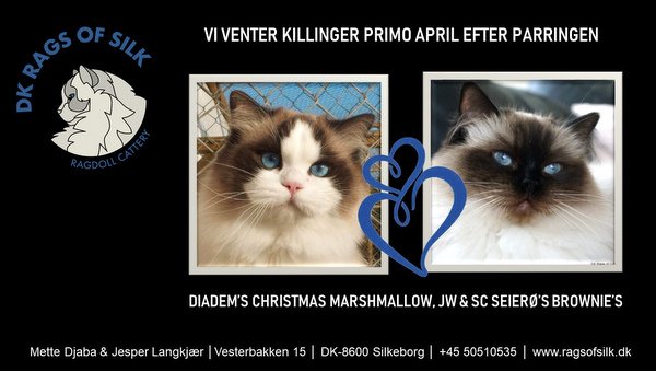 Vi er så glade for at kunne fortælle, at vores skønne hunkat Brownie's venter killinger. Vi er meget taknemmelige for, at vi har fået lov til at låne Karen Jaquets smukke, unge hankat til denne pariring. Han kaldes i dagligdagen for "Skumfidusen" og helt ærligt .. kombinationen mellem Brownie og Skumfidus kan da kun blive supersødt.