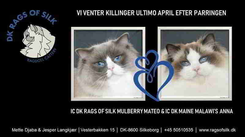Vi er glade for at kunne annoncere, at vi venter kuld efter Anna og Mateo. Det er de første killinger efter dem begge, så vi er meget spændte på at se, hvad de kan give videre. |
