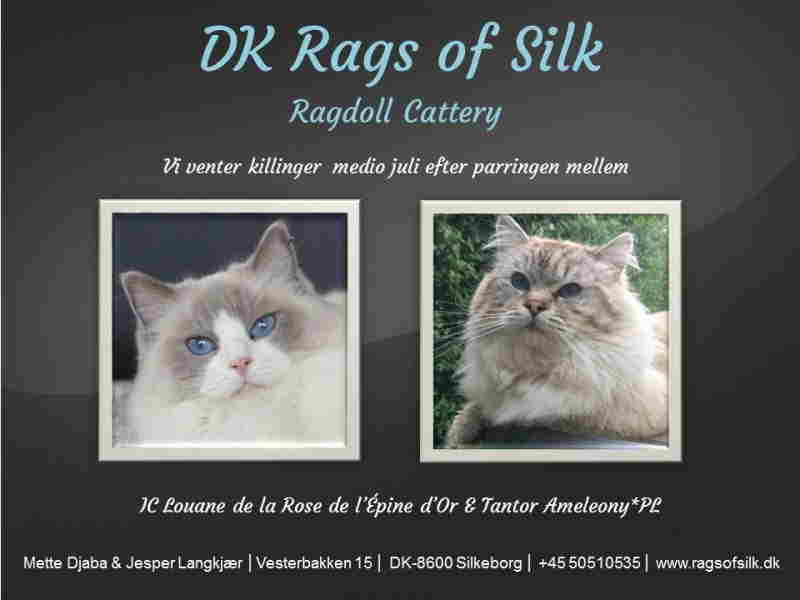 Vi har nu den store glæde at annoncere, at Louane er drægtig med den skønne Tantor. Vi glæder os til at se ragdoll killingerne efter dem medio juli. Louane bor hos vores søde fodervært Jette og vil vokse op hos hende, men vi følger dem tæt. Vi takker Anne Maria fra DK Miss Cindies for at have lånt os dejlige Tantor.