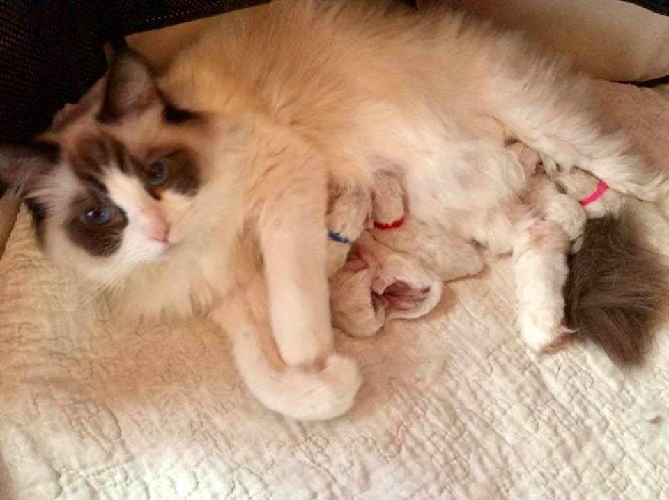 I nat fødte Hamara 6 skønne ragdoll killinger. Der er 3 drenge og 3 piger, der alle har det godt. Det samme gælder mor Hamara, som klarede fødslen så flot. Hun er en meget roligt og afbalanceret mor, som passer killingerne omhyggeligt. Hun er meget stolt af dem og elsker, at vi kommer og nusser og snakker og roser hendes fine babyer.