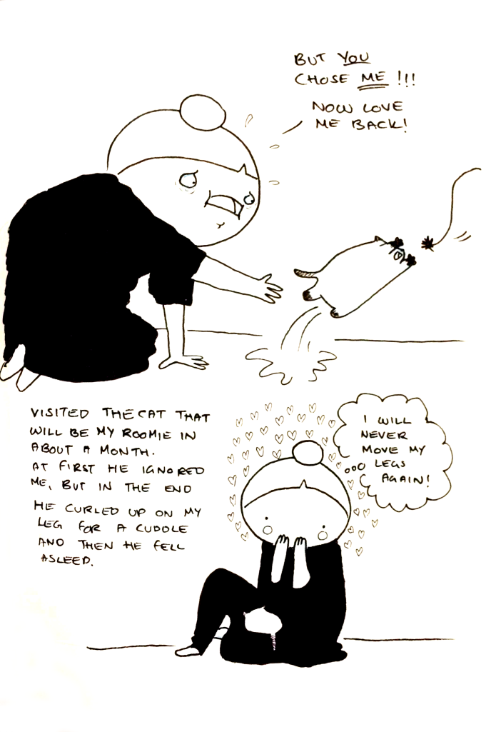 Ginos nye menneskemor hedder Stine og er tegner. Efter sit sidste besøg lavede hun denne totalt uimodståelige tegning. Første gang Stine var her og se killingerne, "valgte" Gino hende ved at kravle op til hende med stor tillid. Da Stine kom denne gang, havde han først travlt med at lege og havde slet ikke tid til at putte og nusse. Heldigvis skiftede han mening.... Denne lille oplevelse har Stine tegnet. Vi elsker bare den måde Stine har ramt både episoden, men også noget mere almengyldigt i forholdet mellem katte og mennesker. Tak til Stine fordi vi fik lov til at bruge tegningen her på hjemmesiden Se flere af Stines dejlige tegninger på Strictlystine.com